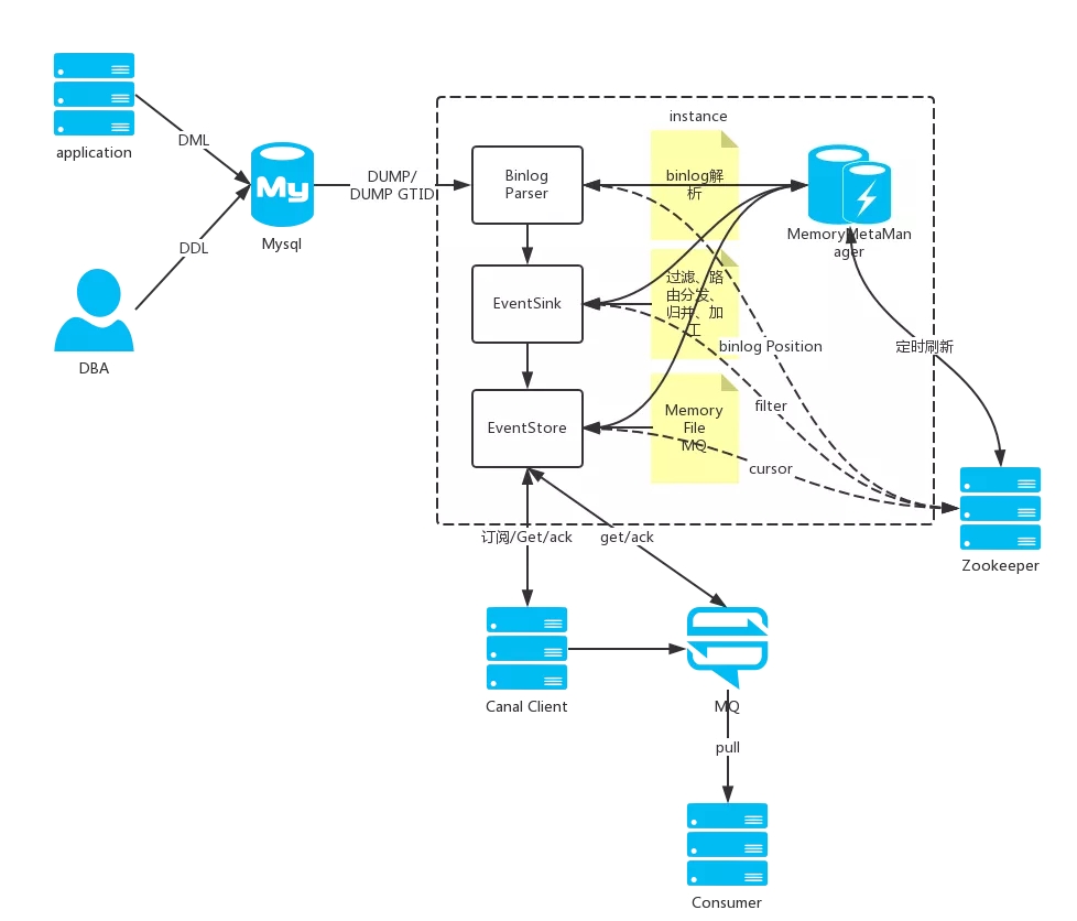canal模拟mysql slave的交互协议,伪装自己为mysql slave,向mysql master发送dump协议
