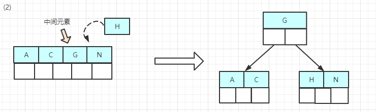 (2)继续插入H,n > 4,中间元素G字母向上分裂到新的节点;