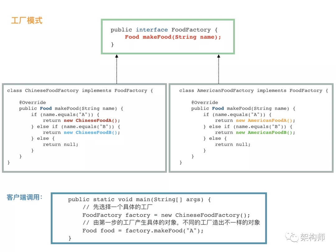 虽然都是调用 makeFood("A") 制作 A 类食物,但是,不同的工厂生产出来的完全不一样。