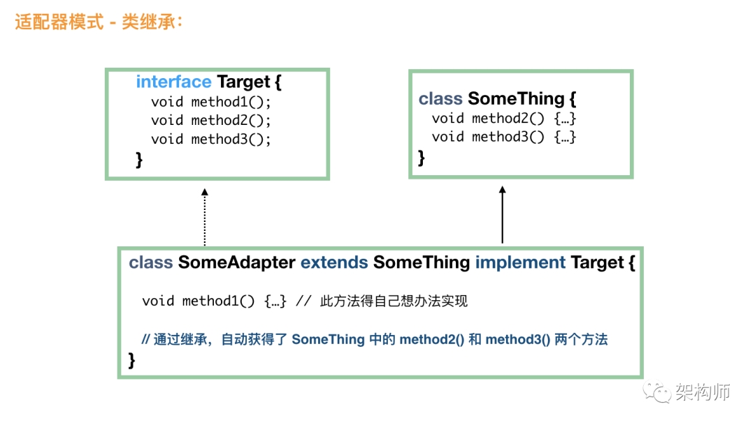 适配器模式做的就是,有一个接口需要实现,但是我们现成的对象都不满足,需要加一层适配器来进行适配。