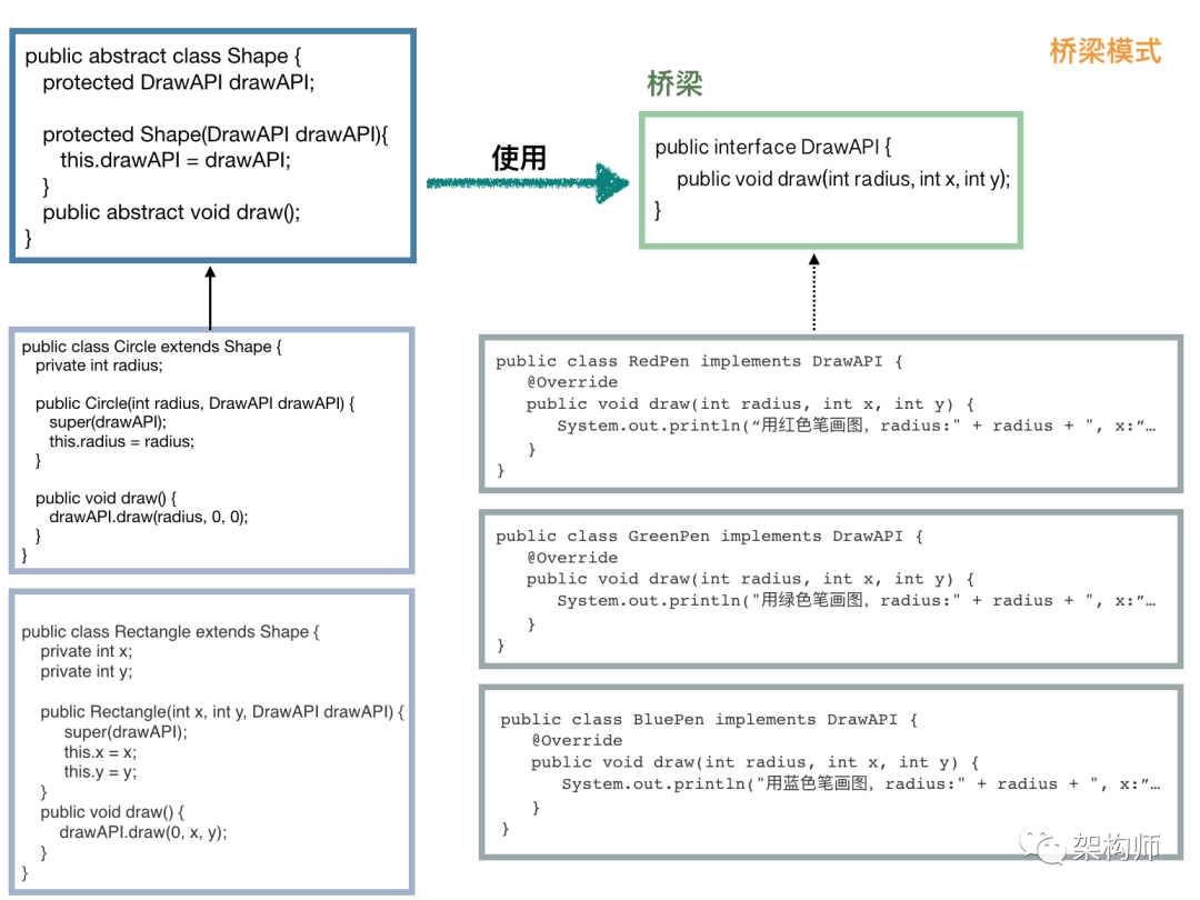 这个时候,大家有没有联想到结构型模式中的桥梁模式,它们其实非常相似,我把桥梁模式的图拿过来大家对比下: