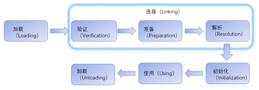 以上2、3、4三个阶段又合称为链接阶段,链接阶段要做的是将加载到JVM中的二进制字节流的类数据信息合并到JVM的运行时状态中。