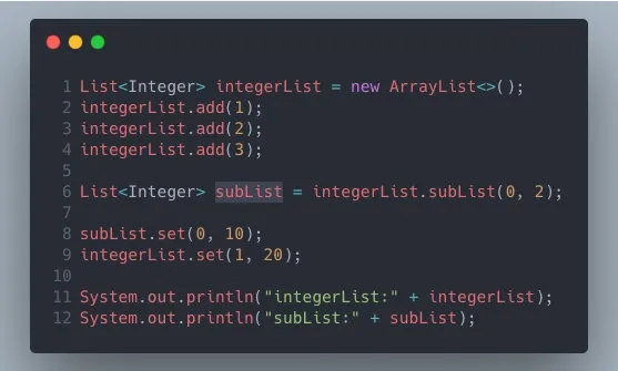 除了 Arrays#asList产生新集合与原始数组互相影响之外,JDK 另一个方法 List#subList 生成新集合也会与原始 List 互相影响。