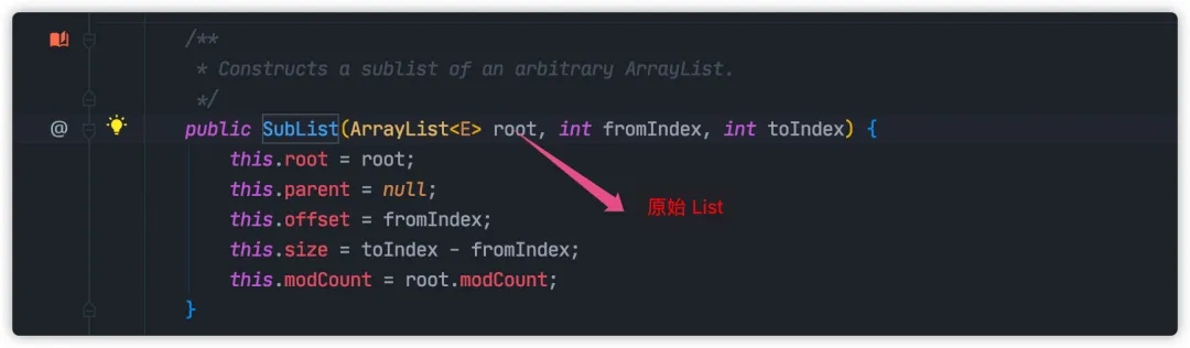 查看 List#subList 实现方式,可以发现这个 SubList 内部有一个 parent 字段保存保存最原始 List 。