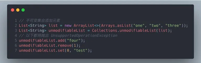 为了防止 List 集合被误操作,我们可以使用 Collections#unmodifiableList 生成一个不可变(immutable)集合,进行防御性编程。