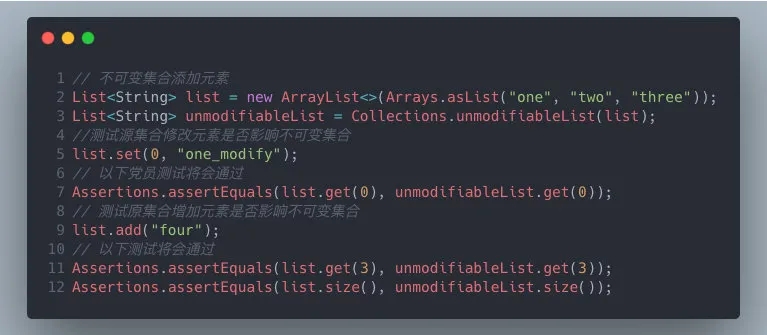 上面单元测试结果将会全部通过,这就代表 Collections#unmodifiableList 产生不可变集合将会被原始 List 所影响。