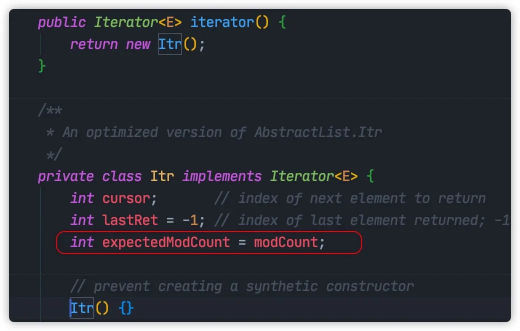 expectedModCount 来源于 list#iterator 方法: