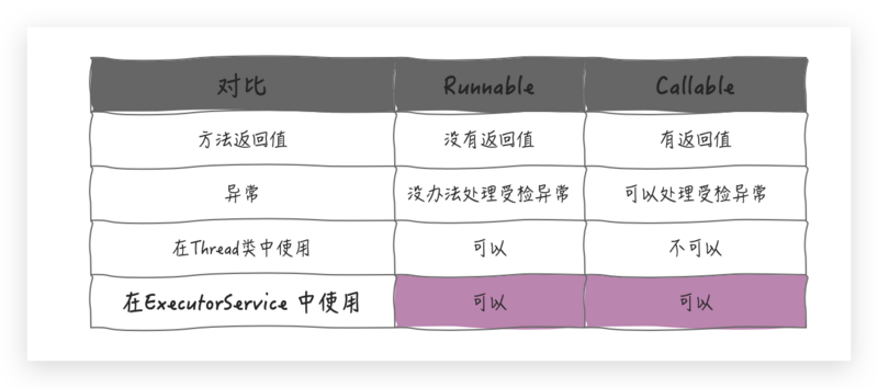 先从执行机制上来看,Runnable 你太清楚了,它既可以用在 Thread 类中,也可以用在 ExecutorService 类中配合线程池的使用;Bu~~~~t, Callable 只能在 *ExecutorService* 中使用,你翻遍 Thread 类,也找不到Callable 的身影