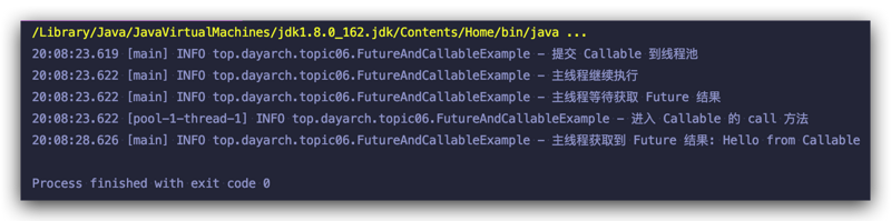 如果你运行上述示例代码,主线程调用 future.get() 方法会阻塞自己,直到子任务完成。我们也可以使用 Future 方法提供的 isDone 方法,它可以用来检查 task 是否已经完成了,我们将上面程序做点小修改:
