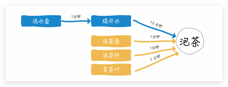 让我心算一下,如果串行总共需要 20 分钟,但很显然在烧开水期间,我们可以洗茶壶/洗茶杯/拿茶叶
