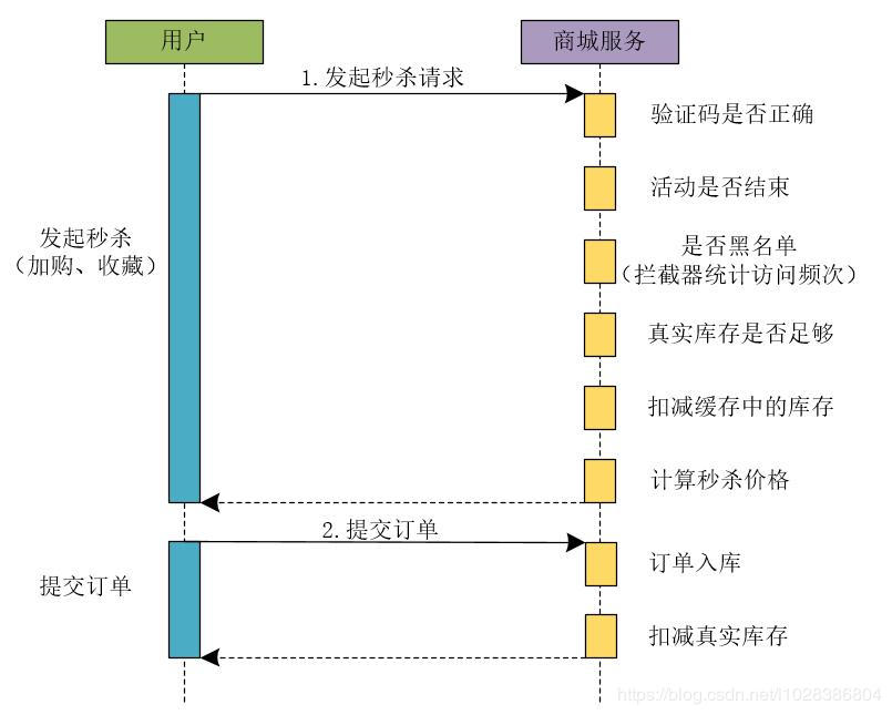用户发起秒杀请求后,商城服务会经过如下业务流程。