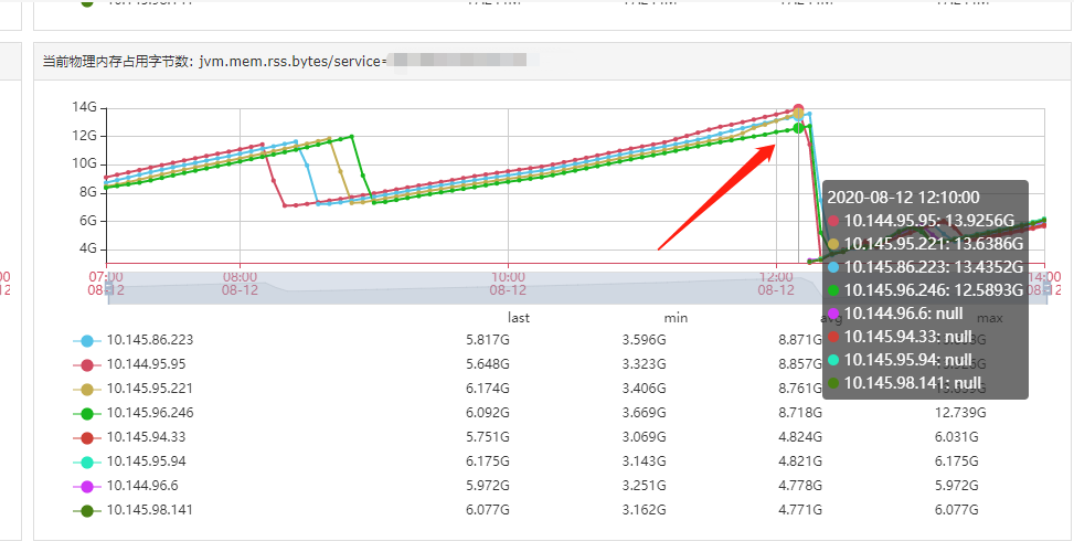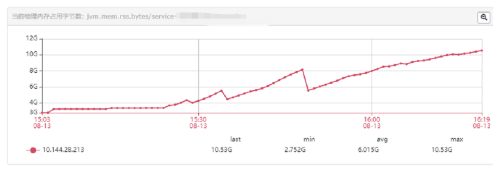 8月12日中午午休时间,我们商业服务收到告警,服务进程占用容器的物理内存(16G)超过了80%的阈值,并且还在不断上升。