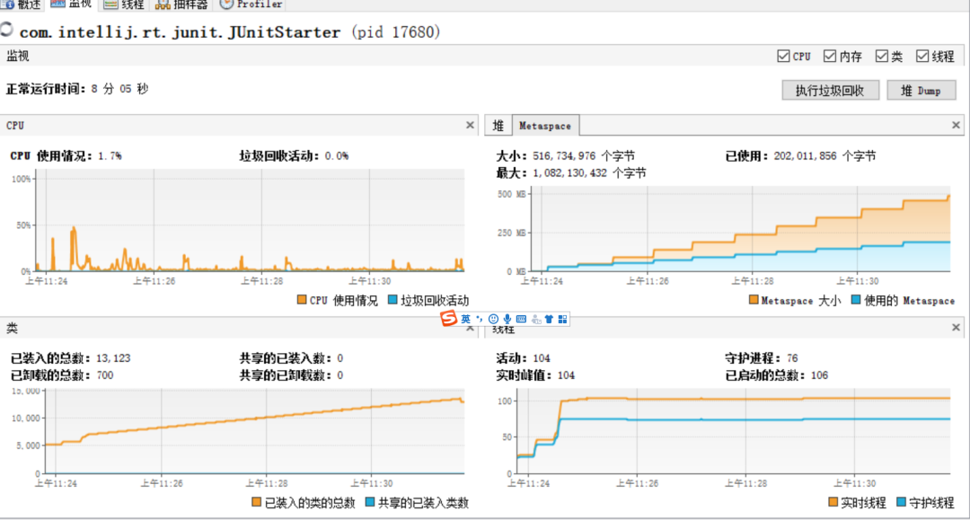 使用JVisualVM观察进程运行 首先限制住元空间,使用参数-XX:MetaspaceSize=64m -XX:MaxMetaspaceSize=128m,然后在本地循环调用出问题的接口。