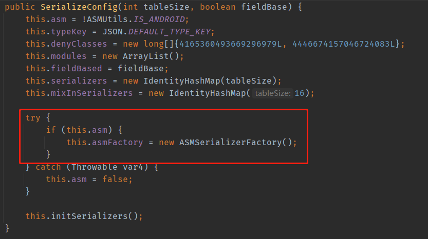SerializeConfig的主要功能是配置并记录每种Java类型对应的序列化类(ObjectSerializer接口的实现类),比如Boolean.class使用BooleanCodec(看命名就知道该类将序列化和反序列化实现写到一起了)作为序列化实现类,float[].class使用FloatArraySerializer作为序列化实现类。这些序列化实现类,有的是FastJSON中默认实现的(比如Java基本类),有的是通过ASM框架生成的(比如用户自定义类),有的甚至是用户自定义的序列化类(比如Date类型框架默认实现是转为毫秒,应用需要转为秒)。当然,这就涉及到是使用ASM生成序列化类还是使用JavaBean的序列化类类序列化的问题,这里判断根据就是是否Android环境(环境变量"java.vm.name"为"dalvik"或"lemur"就是Android环境),但判断不仅这里一处,后续还有更具体的判断。