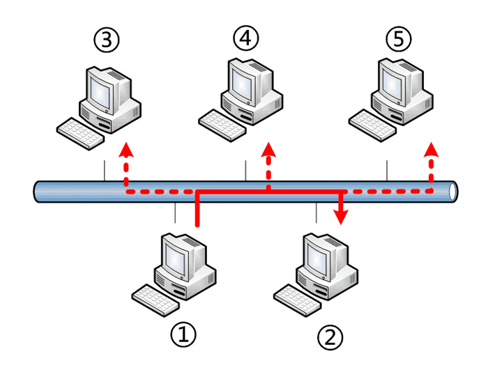上图中,1号计算机向2号计算机发送一个数据包,同一个子网络的3号、4号、5号计算机都会收到这个包。它们读取这个包的"标头",找到接收方的MAC地址,然后与自身的MAC地址相比较,如果两者相同,就接受这个包,做进一步处理,否则就丢弃这个包。这种发送方式就叫做"广播"(broadcasting)。