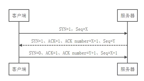 1.客户端发送一个TCP包。设置SYN=1(请求建立连接)、Seq=X(随机产生的序列号) 2.服务器发回确认包(ACK)应答。SYN=1、ACK=1、ACK number = X+1、Seq = Y(随机产生) 3.客户端再次发送确认包(ACK) 。SYN=0、ACK=1、ACK number= Y+1、Seq = X+1