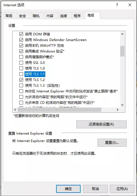 要关闭浏览器对 TLS 1.0 和 1.1 的支持,可以在 Internet 选项中修改:
