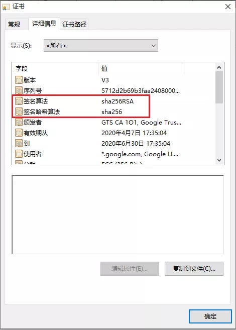 验证证书签名合法性使用 SHA256 作哈希算法检验。相关的算法的用处将在后文中详解。
