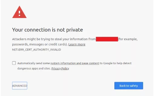 浏览器会出现以下画面,告诉你正在遭受中间人攻击,因为证书被篡改了: