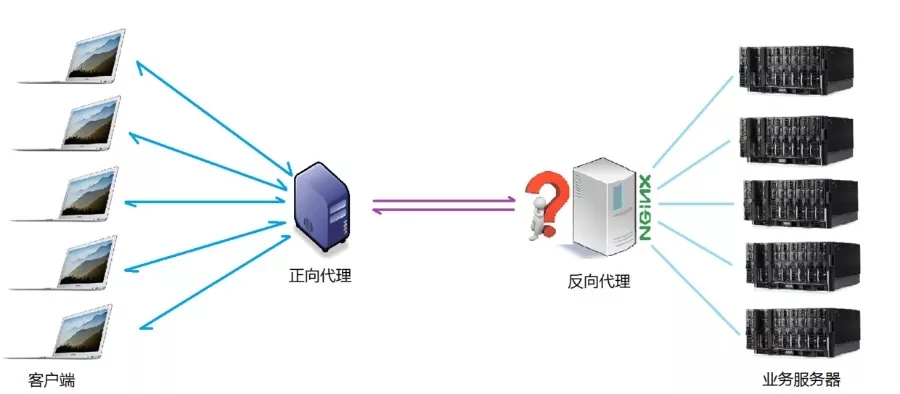 通过上述的图解大家就可以看清楚了,多个客户端给服务器发送的请求,Nginx服务器接收到之后,按照一定的规则分发给了后端的业务处理服务器进行处理了。此时~请求的来源也就是客户端是明确的,但是请求具体由哪台服务器处理的并不明确了,Nginx扮演的就是一个反向代理角色