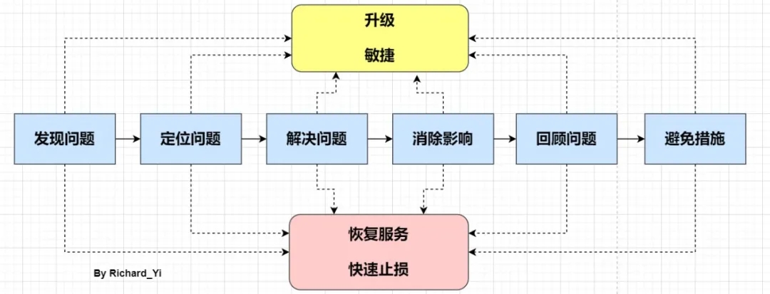 只不过这里先提示一下。在线上应急过程中要记住,只有一个总体目标:尽快恢复服务,消除影响。不管处于应急的哪个阶段,我们首先必须想到的是恢复问题,恢复问题不一定能够定位问题,也不一定有完美的解决方案,也许是通过经验判断,也许是预设开关等,但都可能让我们达到快速恢复的目的,然后保留部分现场,再去定位问题、解决问题和复盘。