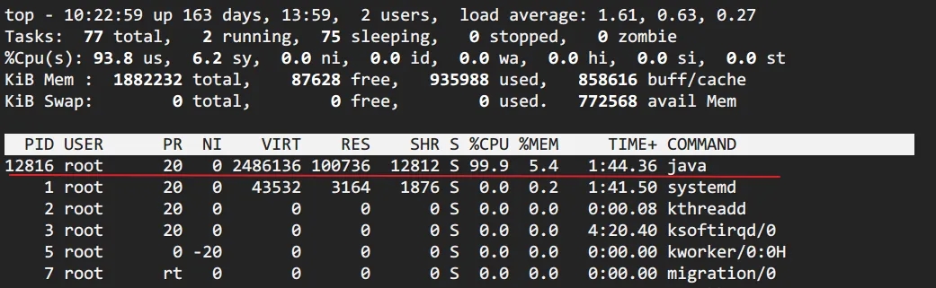 top 定位CPU 最高的进程执行top命令,查看所有进程占系统CPU的排序,定位是哪个进程搞的鬼。在本例中就是咱们的java进程。PID那一列就是进程号。(对指示符含义不清楚的见【附录】)