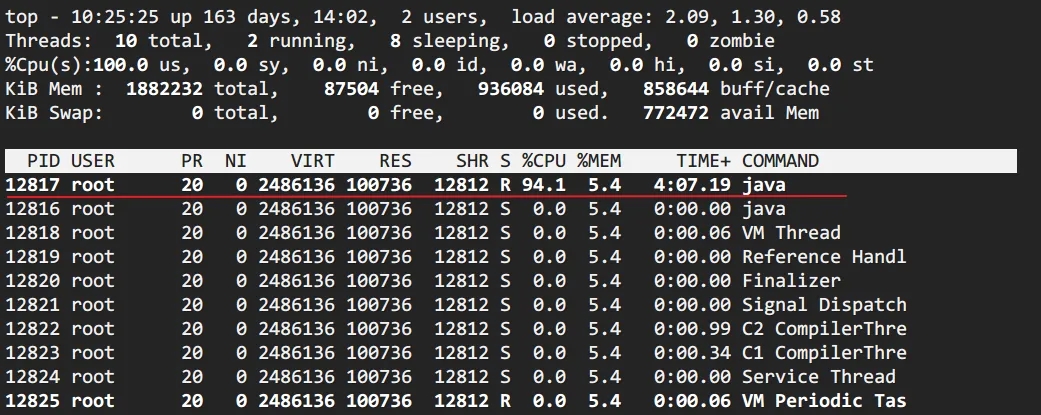2.top -Hp pid 定位使用 CPU 最高的线程