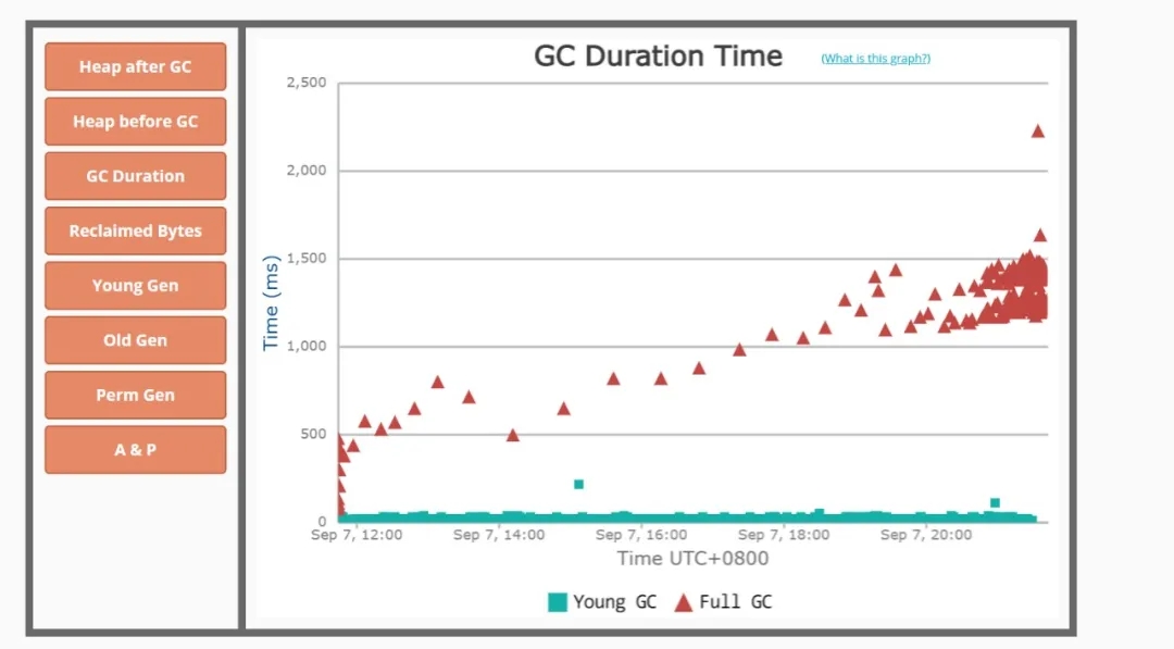 你也可以从full GC 的效果来推断问题,正常情况下,一次full GC应该会回收大量内存,所以 正常的堆内存曲线应该是呈锯齿形。如果你发现full gc 之后堆内存几乎没有下降,那么可以推断:**堆中有大量不能回收的对象且在不停膨胀,使堆的使用占比超过full GC的触发阈值,但又回收不掉,导致full GC一直执行。换句话来说,可能是内存泄露了。