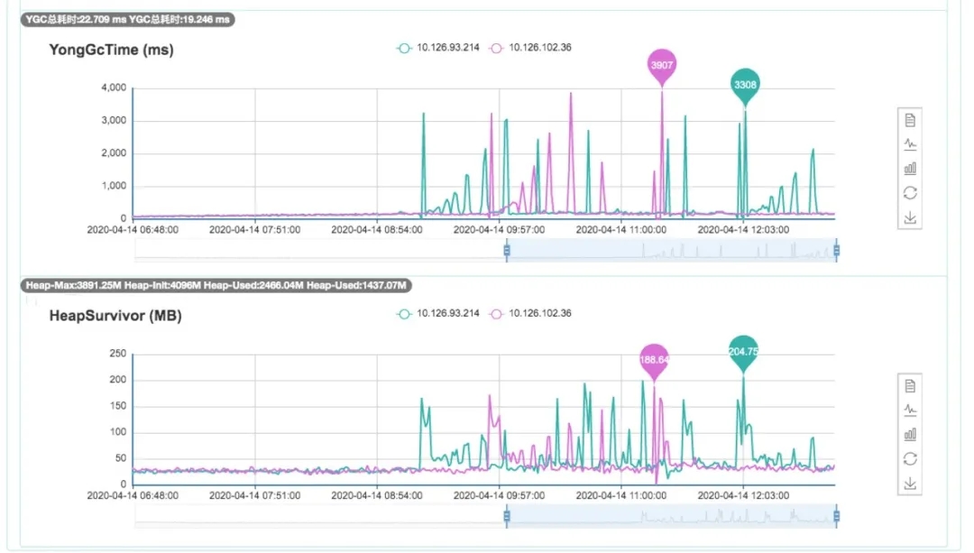 根据下面的监控图可以看出:正常情况下,Survivor区的使用率一直维持在很低的水平(大概30M左右),但是上线后,Survivor区的使用率开始波动,最多的时候快占满0.2G了。而且,YGC耗时和Survivor区的使用率基本成正相关。因此,我们推测:应该是长生命周期的对象越来越多,导致标注和复制过程的耗时增加。