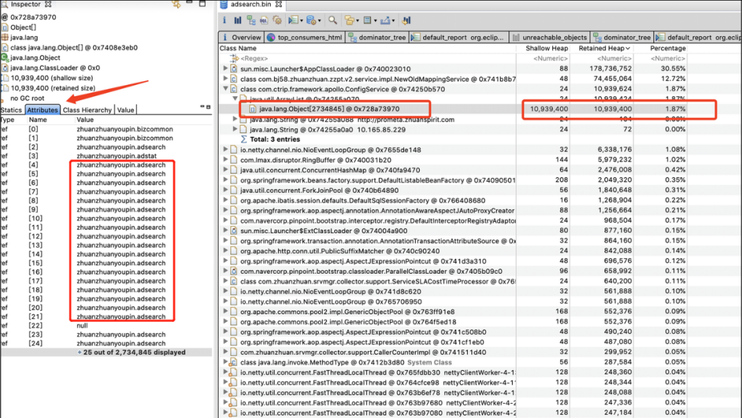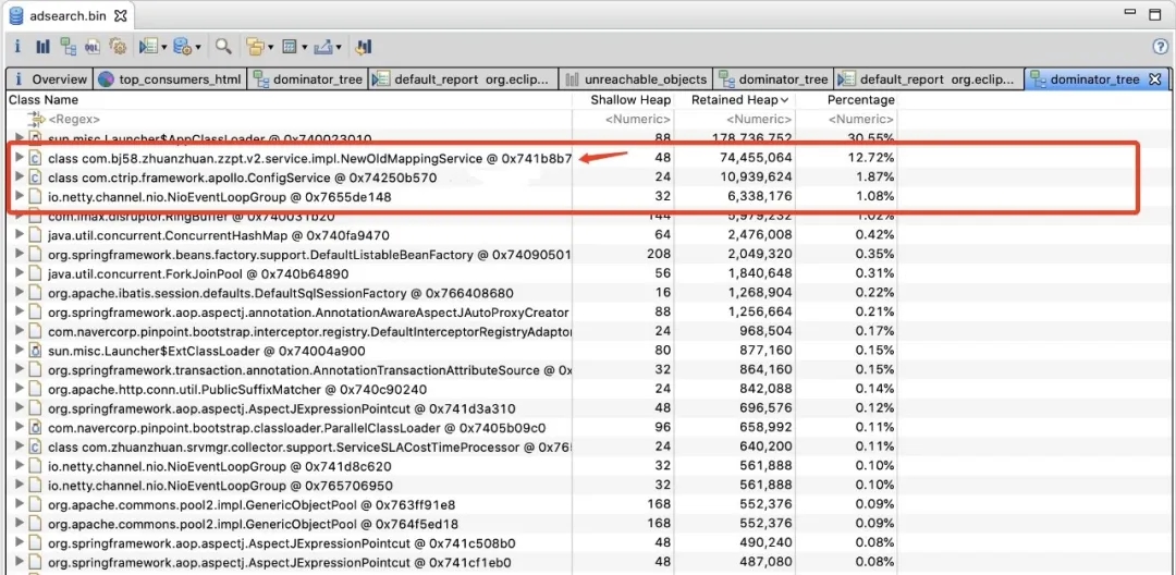 代码排查没有进展后,我们开始从堆内存文件中寻找线索,使用MAT工具导入了第1步dump出来的堆文件后,然后通过Dominator Tree视图查看到了当前堆中的所有大对象。