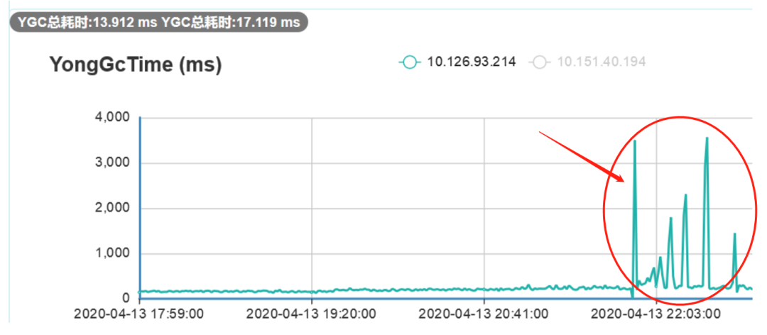 收到告警后,我们第一时间查看了监控系统,立马发现了YoungGC耗时过长的异常。我们的程序大概在21点50左右上线,通过下图可以看出:在上线之前,YGC基本几十毫秒内完成,而上线后YGC耗时明显变长,最长甚至达到了3秒多。