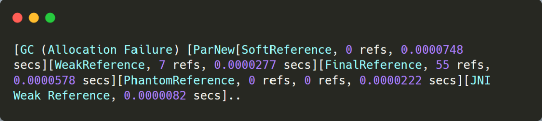 针对第1类问题,可以通过以下参数显示GC处理Reference的耗时-XX:+PrintReferenceGC。添加此参数后,可以看到不同类型的 reference 处理耗时都很短,因此又排除了此项因素。