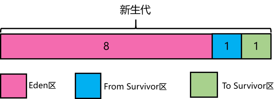 YGC 在新生代中进行,首先要清楚新生代的堆结构划分。新生代分为Eden区和两个Survivor区,其中Eden:from:to = 8:1:1 (比例可以通过参数 –XX:SurvivorRatio 来设定 ),这是最基本的认识。