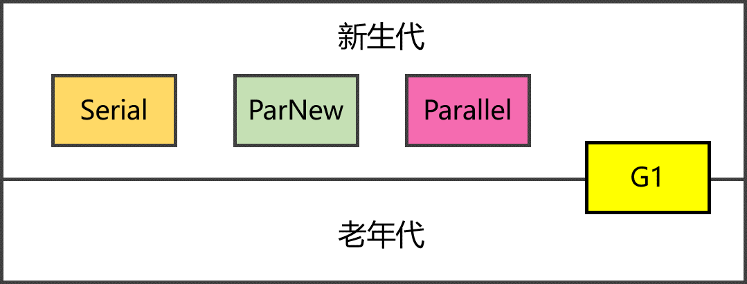 G1(Garage-First回收器),JDK 9及以后版本的默认回收器,兼顾新生代和老年代,将堆拆成一系列Region,不要求内存块连续,新生代仍然是并行收集。