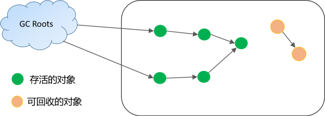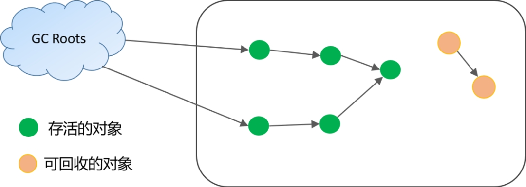 YGC通过可达性分析算法,从GC Root(可达对象的起点)开始向下搜索,标记出当前存活的对象,那么剩下未被标记的对象就是需要回收的对象。