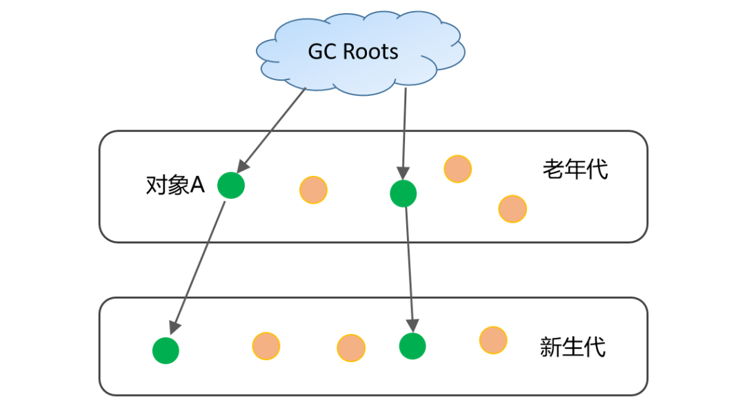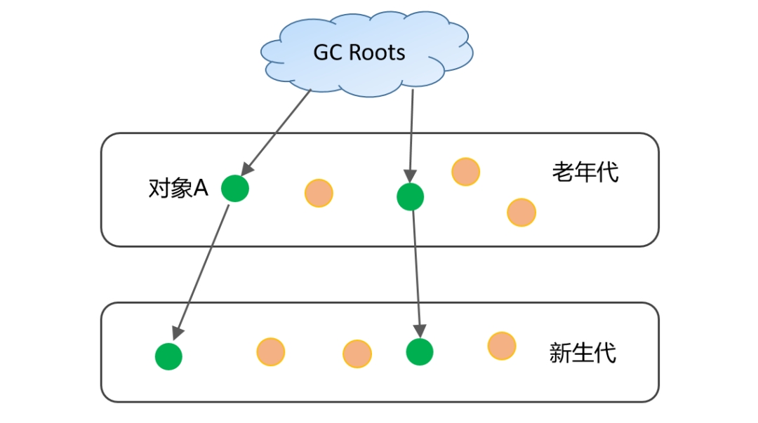 另外需要注意的是,针对下图中跨代引用的情况,老年代的对象A也必须作为GC Root的一部分,但是如果每次YGC时都去扫描老年代,肯定存在效率问题。在HotSpot JVM,引入卡表(Card Table)来对跨代引用的标记进行加速。