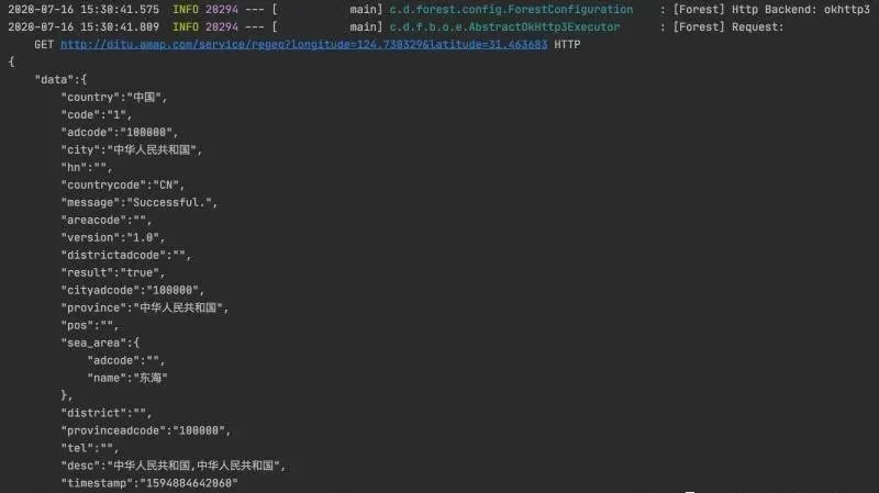 日志打印,Forest打印了内部所用的http框架,和实际请求url和返回。当然日志可以通过配置去控制开关。