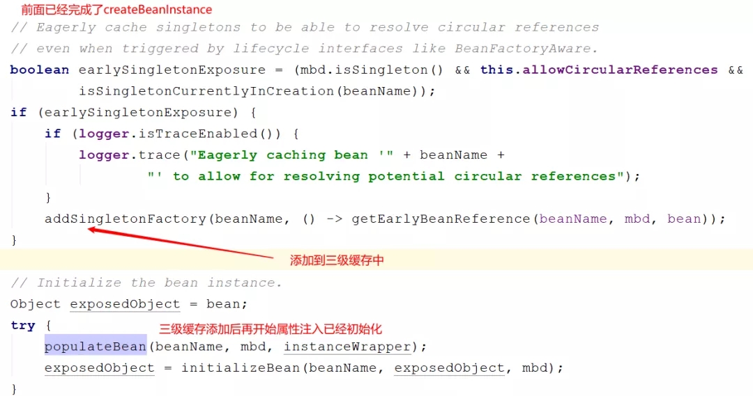 在完成Bean的实例化后,属性注入之前Spring将Bean包装成一个工厂添加进了三级缓存中,对应源码如下: