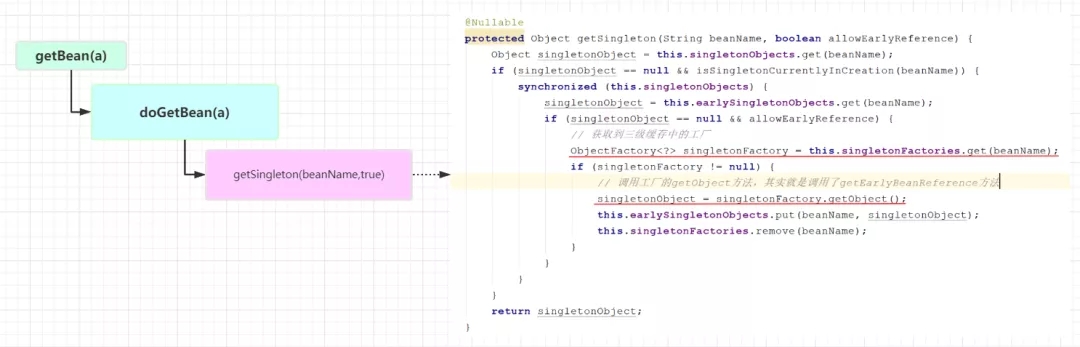 因为B需要注入A,所以在创建B的时候,又会去调用getBean(a),这个时候就又回到之前的流程了,但是不同的是,之前的getBean是为了创建Bean,而此时再调用getBean不是为了创建了,而是要从缓存中获取,因为之前A在实例化后已经将其放入了三级缓存singletonFactories中,所以此时getBean(a)的流程就是这样子了