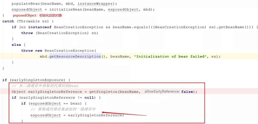 回到上面的例子,我们对A进行了AOP代理的话,那么此时getEarlyBeanReference将返回一个代理后的对象,而不是实例化阶段创建的对象,这样就意味着B中注入的A将是一个代理对象而不是A的实例化阶段创建后的对象。