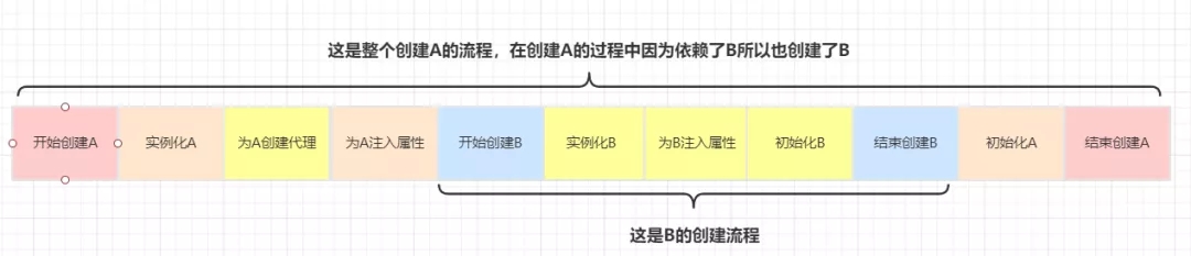 从上图中我们可以看到,虽然在创建B时会提前给B注入了一个还未初始化的A对象,但是在创建A的流程中一直使用的是注入到B中的A对象的引用,之后会根据这个引用对A进行初始化,所以这是没有问题的。