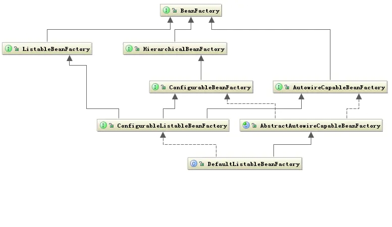BeanFactory 有三个子类:ListableBeanFactory、HierarchicalBeanFactory 和 AutowireCapableBeanFactory。但是从上图中我们可以发现最终的默认实现类是 DefaultListableBeanFactory,实现了所有的接口。那为何要定义这么多层次的接口呢?查阅这些接口的源码和说明发现,每个接口都有使用的场合,它主要是为了区分在 Spring 内部对象的传递和转化过程中,对对象的数据访问所做的限制。例如 ListableBeanFactory 接口表示这些 Bean 是可列表的,而 HierarchicalBeanFactory 表示的这些 Bean 是有继承关系的,也就是每个 Bean 有可能有父 Bean。AutowireCapableBeanFactory 接口定义 Bean 的自动装配规则。这四个接口共同定义了 Bean 的集合、Bean 之间的关系、以及 Bean 行为。