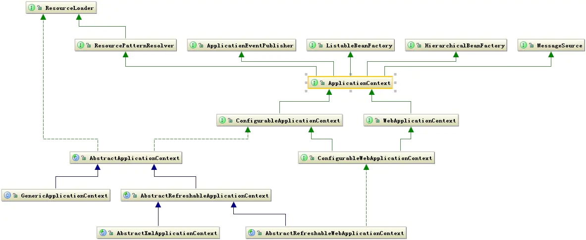 从上图中可以看出 ApplicationContext 继承了 BeanFactory,这也说明了 Spring 容器中运行的主体对象是 Bean,另外 ApplicationContext 继承了 ResourceLoader 接口,使得 ApplicationContext 可以访问到任何外部资源,这将在 Core 中详细说明。