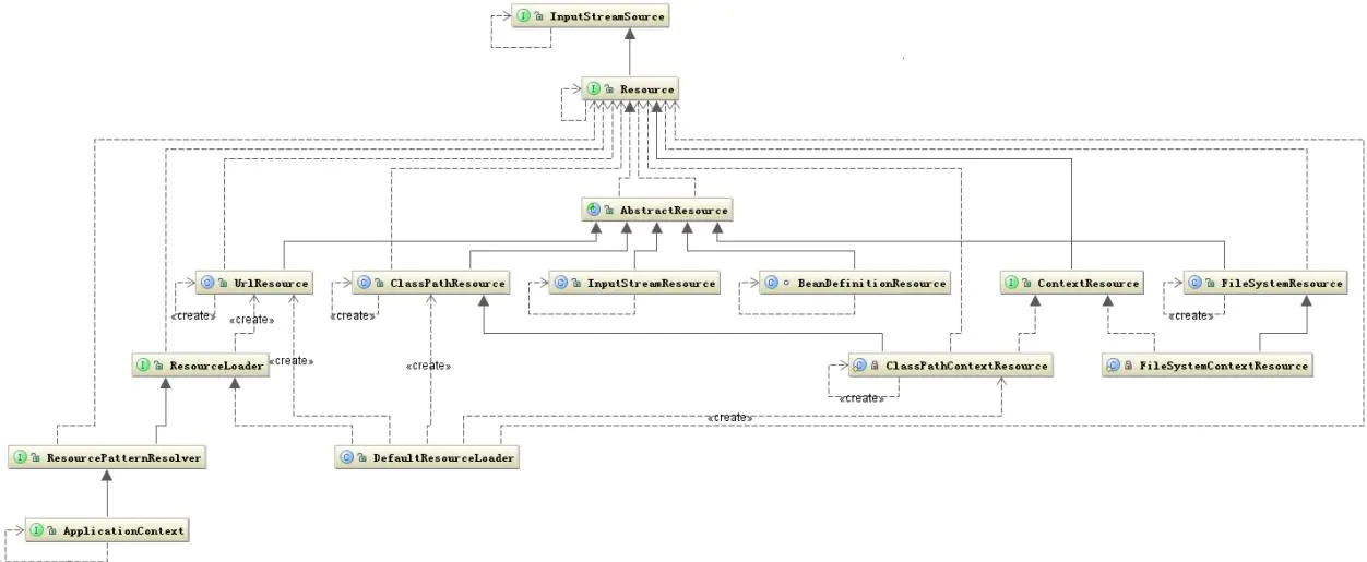 从上图可以看出 Resource 接口封装了各种可能的资源类型,也就是对使用者来说屏蔽了文件类型的不同。对资源的提供者来说,如何把资源包装起来交给其他人用这也是一个问题,我们看到 Resource 接口继承了 InputStreamSource 接口,这个接口中有个 getInputStream 方法,返回的是 InputStream 类。这样所有的资源都被可以通过 InputStream 这个类来获取,所以也屏蔽了资源的提供者。另外还有一个问题就是加载资源的问题,也就是资源的加载者要统一,从上图中可以看出这个任务是由 ResourceLoader 接口完成,他屏蔽了所有的资源加载者的差异,只需要实现这个接口就可以加载所有的资源,他的默认实现是 DefaultResourceLoader。