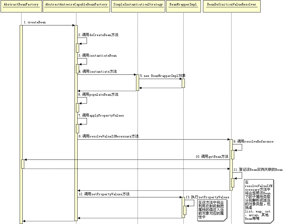 如果是普通的 Bean 就直接创建他的实例,是通过调用 getBean 方法。下面是创建 Bean 实例的时序图: