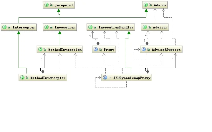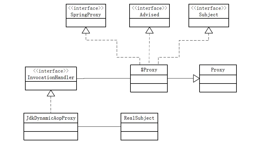 Spring Aop 中 Jdk 动态代理就是利用代理模式技术实现的。在 Spring 中除了实现被代理对象的接口外,还会有 org.springframework.aop.SpringProxy 和 org.springframework.aop.framework.Advised 两个接口。Spring 中使用代理模式的结构图如下: