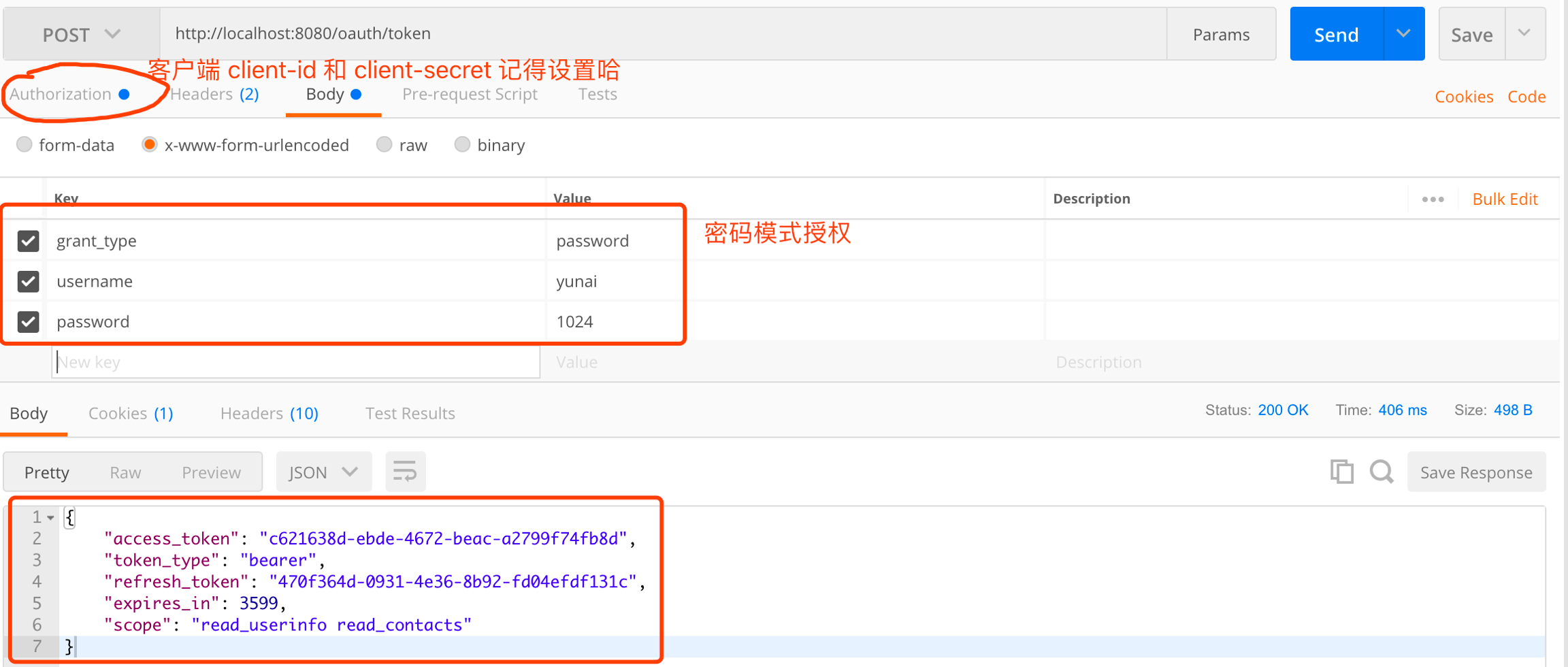 POST 请求 http://localhost:8080/oauth/token 地址,使用密码模式进行授权。如下图所示: