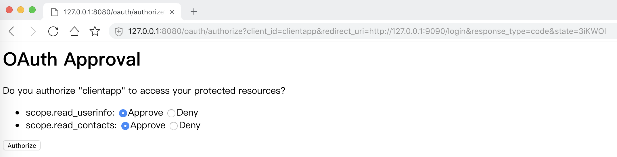 ③ 点击「Authorize」按钮,完成用户的授权。授权完成后,浏览器重定向到 XXX 系统的 http://127.0.0.1:9090/login 回调地址。
