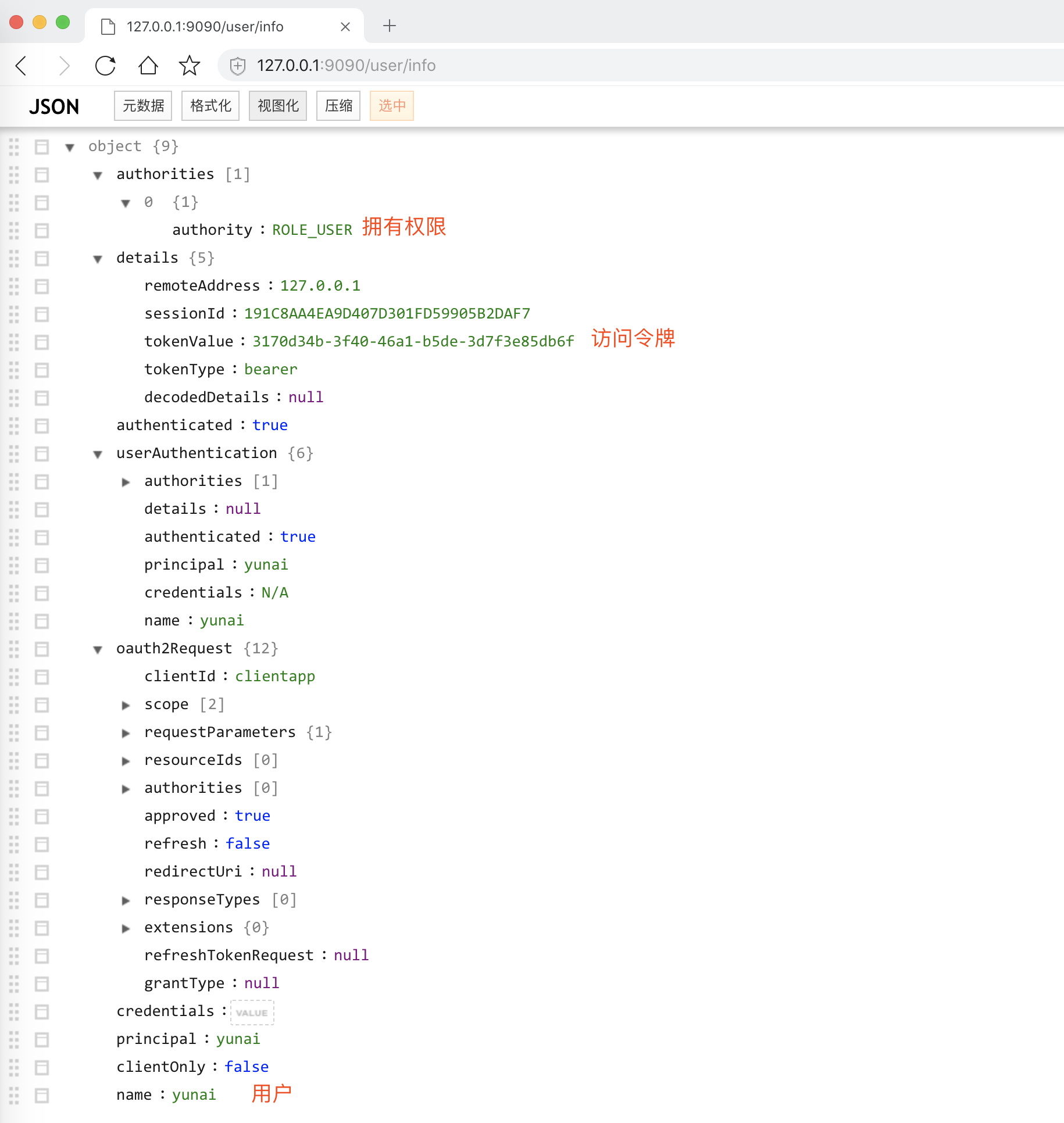 获取授权码完成后,自动跳转到登录前的 http://127.0.0.1:9090/user/info 地址,打印出当前登录的用户信息。如下图所示: