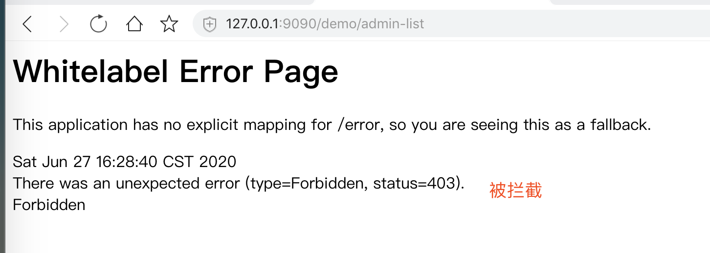 ② 使用浏览器,访问 http://127.0.0.1:9090/demo/admin-list 地址,失败。如下图所示: